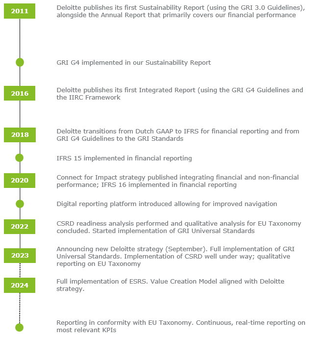 This Report has been prepared in accordance with the European Sustainability Reporting Standards (ESRS) as set out in the Annex 1 to the Commission Delegated Regulation (EU) 2023/2772 of July 31, 2023 supplementing Directive 2013/34/EU of the European Parliament and of the Council. An ESRS Content index is included in this report (see pages 161 and following). In this table, we provide an overview of our compliance and non-compliance with the ESRS. As Deloitte is a member of UN Global Compact the Netherlands, we connect our impacts with the UN Sustainable Development Goals that we deem most relevant to Deloitte.